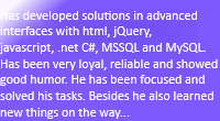 //I have specialized in some of microsofts .net technologies as C#, asp.net and MSsql. My aim is to enlarge